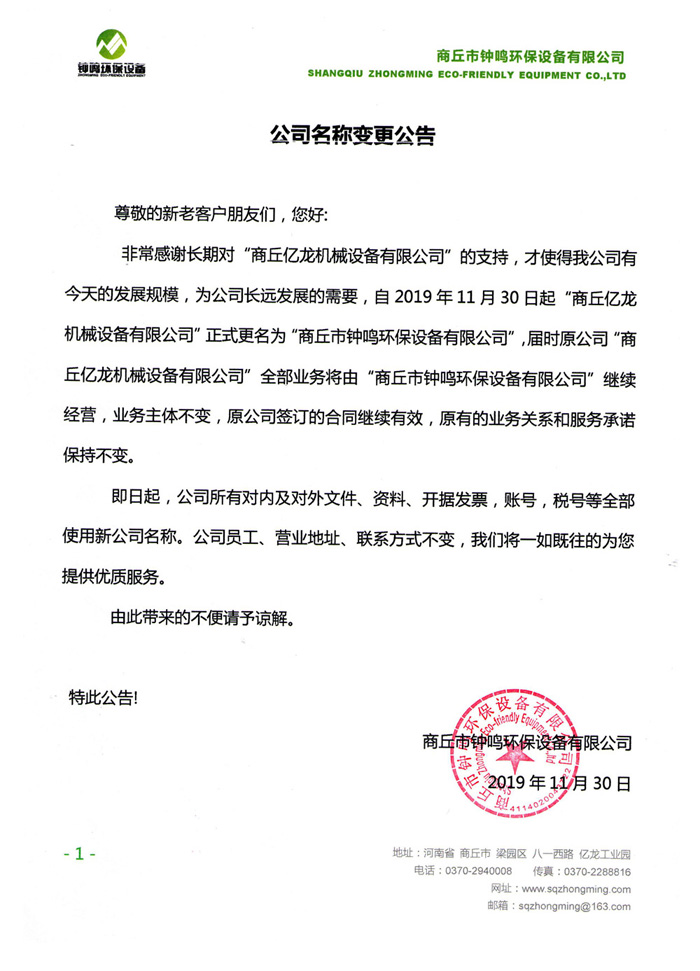 即日起,商丘億龍正式更名為鐘鳴環(huán)保設(shè)備,具體請(qǐng)查看更名公告。